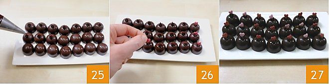 Decora cada bombón con un pequeño copo de ganache en la superficie 25 y un azucarillo en forma de corazón en la parte superior 26. ¡Aquí están: los bombones están listos 27, serán un éxito!