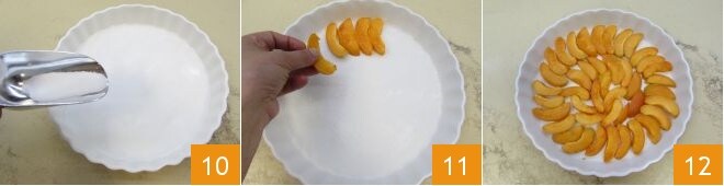 Tomad vuestro molde, engrasadlo y cubridlo con azúcar 10, sacudiendo ligeramente el molde para quitar el exceso. Colocad los albaricoques en forma de círculo en el molde 11 hasta cubrir toda la base 12.