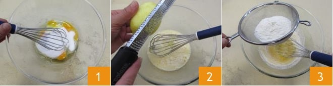 Para preparar el clafoutis de albaricoques, comenzad rompiendo los huevos en un bol y añadid el azúcar 1. Batid con una varilla, o si preferís con una batidora eléctrica, hasta obtener una mezcla clara y espumosa que alcance el doble del volumen inicial. Agregad entonces la ralladura de limón 2 y la harina tamizada directamente en el bol 3 y mezclad rápidamente con una varilla, para evitar que se formen grumos.