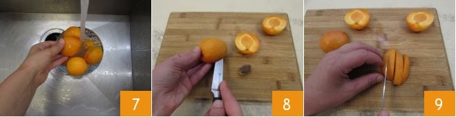 En este punto, lavad los albaricoques bajo agua corriente 7 y con la ayuda de un cuchillo, divididlos por la mitad 8 y eliminad el hueso. Cortad cada mitad de albaricoque en 4 rodajas 9.