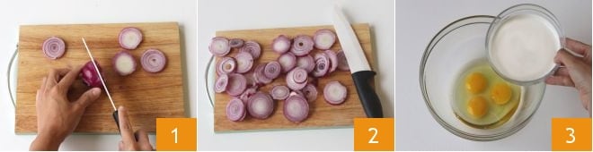 Para realizar el clafoutis salado de cebollas rojas, primero pelad y cortad las cebollas en rodajas de 3-4 mm de grosor (1-2): en total necesitaréis unos 250 g de cebollas en rodajas. Pasad a la preparación de la masa: verted los huevos en un bol grande, unid la nata 3