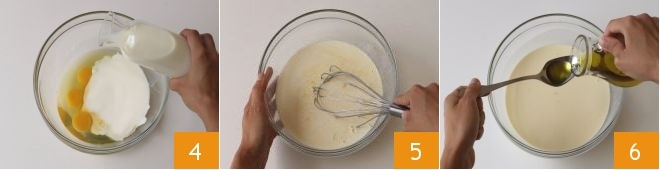 y la leche 4 y mezclad todo con un batidor 5. Añadid el aceite de oliva 6