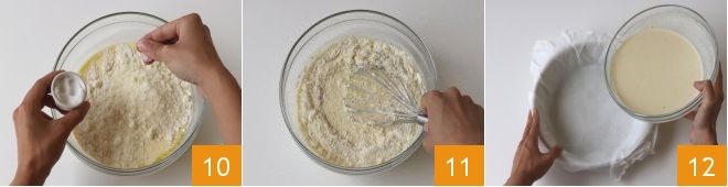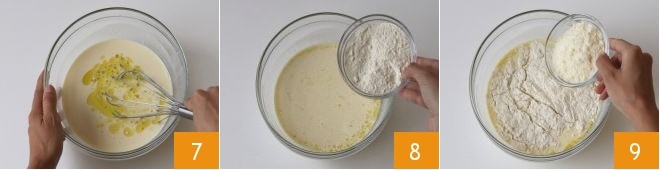y mezclad de nuevo para incorporarlo a la mezcla 7. En este punto, unid también la harina 8 y el Grana Padano DOP rallado 9,