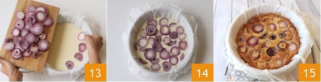 Colocad las rodajas de cebolla sobre la mezcla 13, distribuyéndolas uniformemente por toda la superficie 14, luego hornead en horno estático precalentado a 180° durante unos 40-50 minutos hasta que esté bien dorado 15. ¡Vuestro clafoutis salado está listo para ser disfrutado!