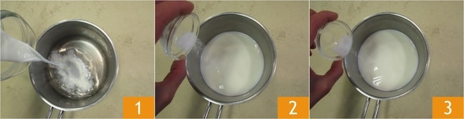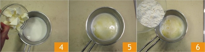 Añade también la mantequilla 4 y calienta la mezcla hasta que alcance el punto de ebullición y la mantequilla esté completamente derretida 5. Ahora fuera del fuego vierte la harina 6.