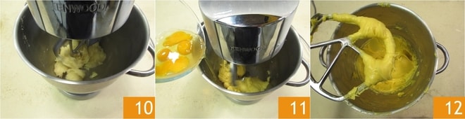 Vierte la masa obtenida en una batidora, equipada con gancho de hoja. Hazla girar rápidamente 10 para enfriarla hasta alcanzar los 60°. Ahora introduce los huevos uno a uno 11, hasta obtener una mezcla suave, brillante y tibia 12. Transfiere a una manga pastelera, con boquilla lisa de 12 mm.
