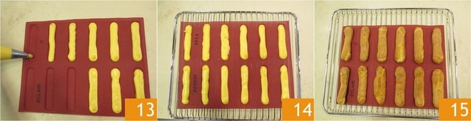 Ahora forma los éclair utilizando la alfombrilla microperforada 13, colócala sobre la rejilla del horno 14 y hornea en horno estático precalentado a 185° durante unos 30-35 min. Durante los últimos 5 minutos abre la puerta del horno para liberar el exceso de humedad. Cuando los éclair hayan alcanzado un bonito color avellana, puedes sacarlos 15. Déjalos enfriar completamente y mientras prepara la crema.
