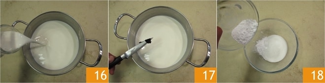 Vierte en un cazo la leche y 110 g de nata (los otros 15 g se utilizarán después) 16, añade las semillas que hayas extraído de la vaina de vainilla 17 y lleva todo a ebullición. Mientras tanto en un bol une el azúcar con el almidón de maíz 18.