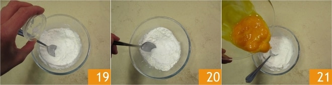 Añade también el almidón de arroz, una pizca de sal 19 y mezcla 20. Luego vierte también las yemas dentro del bol con los polvos 21.