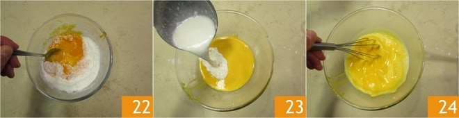 Mezcla con una cuchara o una espátula 22 hasta obtener una mezcla lisa y homogénea. Tan pronto como la leche comience a hervir recoge aproximadamente un cucharón y viértelo en la mezcla de yemas 23. Mezcla para templarlo 24.