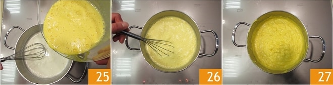 Luego vierte todo nuevamente en el cazo con la leche restante 25. Mezcla continuamente con la batidora de varillas de manera enérgica 26. La crema deberá alcanzar la temperatura de 82°-84°, para estar lista 27.
