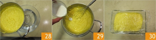 Transfiere la crema a un bol con agua y hielo, para enfriarla rápidamente 28. Añade también los 15 g de nata restantes 29 y mezcla hasta que ya no esté caliente. Transfiere a un bol bajo y ancho, cubre con film en contacto y deja enfriar en la nevera durante al menos 2 horas.