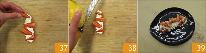 Por último decora con las fresas cortadas en cuartos 37, la ralladura de limón 38, las grosellas y las flores de saúco. Los éclair de crema con nata están listos, consérvalos en la nevera hasta el momento de servirlos 39!