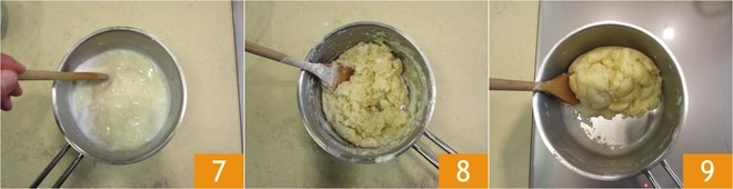 Mezcla con una cuchara de madera 7, hasta que esté completamente absorbida 8. Ahora vuelve a los fogones y cocina la mezcla, mezclando a menudo, hasta que se despegue bien de los bordes y esté seca 9, tardará unos pocos minutos.