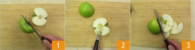 Para preparar el Club Sándwich del Tirol del Sur, lo primero que hay que hacer es cortar la manzana por la mitad 1, quitar el corazón central con un sacabolas 2 y obtener rebanadas finas 3.