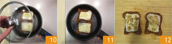 Cubre con una tapa 10, baja el fuego y deja que el queso se derrita 11. Coloca las nueces en el queso derretido 12.