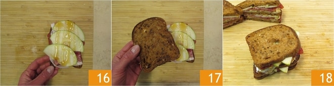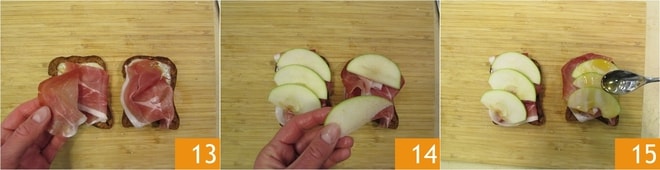 Añade encima las rebanadas de speck 13 y las rebanadas de manzana 14. Añade una capa de miel sobre las manzanas 13.