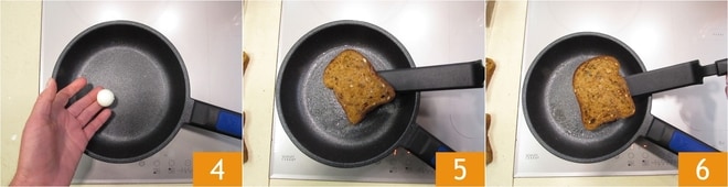 Ahora en una sartén, añade una nuez de mantequilla 4 y, tan pronto como esté derretida, coloca las rebanadas de pan dentro 5. Tóstenlo a fuego alto por ambos lados 6, debe quedar bien dorado.