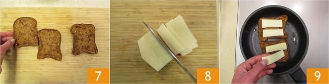 Coloca las rebanadas de pan en una tabla de cortar 7. Corta el queso en rebanadas 8 y colócalo solo en 4 de las 6 rebanadas de pan. Colócalas nuevamente en la sartén 9.