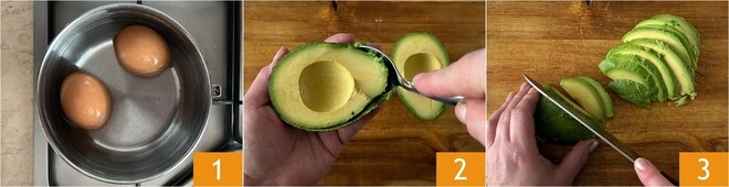 Para realizar el club sándwich de salmón, comienza preparando los huevos duros: pon los huevos enteros en un cazo, cúbrelos con agua y cuécelos durante 8 minutos desde que empiece a hervir 1. Mientras tanto, prepara los otros ingredientes: divide el aguacate por la mitad, extrae el hueso y separa la pulpa de la piel con la ayuda de una cuchara 2, luego córtala en rodajas no demasiado finas 3.