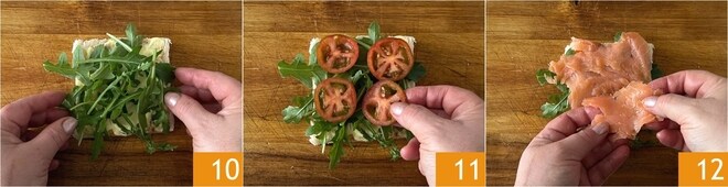 Añade algunas hojas de rúcula 10, coloca las rodajas de tomatitos 11 y condimenta con una pizca de sal. Continúa con el salmón ahumado 12.