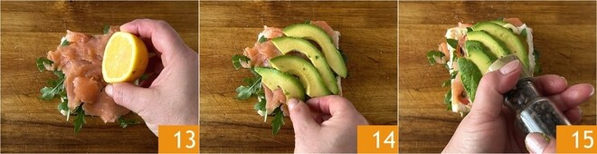 Vierte unas gotas de jugo de limón 13, luego coloca las rodajas de aguacate 14 y condimenta con una pizca de pimienta 15.