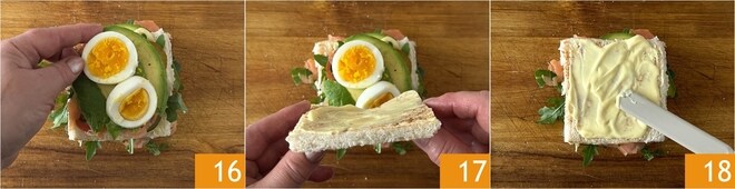 Por último, añade las rodajas de huevo duro 16. Unta otra rebanada de pan con mayonesa y colócala con el lado de la mayonesa hacia los huevos 17. Unta con mayonesa también el lado que queda hacia arriba 18 y continúa repitiendo la misma secuencia de ingredientes.