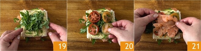 Rúcula 19, tomates 20 y sal, luego salmón ahumado 21 y jugo de limón.