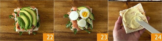 Finalmente, aguacate 22, pimienta y huevos duros 23. Unta otra rebanada de pan con mayonesa 24.