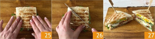 Cubre el sándwich colocando siempre el lado del pan con la mayonesa hacia abajo 25. Inserta dos palillos en dos esquinas opuestas para estabilizar las capas y divide el club sándwich por la mitad 26. Procede de la misma manera para realizar también el segundo. ¡Tu club sándwich de salmón está listo para ser disfrutado 27!