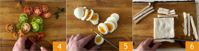 Lava y corta los tomatitos también 4. Pela los huevos que mientras tanto se habrán enfriado un poco y córtalos en rodajas 5. Ahora derrite la mantequilla en otro cazo y quita la corteza de las rebanadas de pan de molde 3.