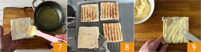 Pincela las rebanadas de pan con la mantequilla derretida 7, luego tuéstalas brevemente en una parrilla por ambos lados 8. Estás listo para montar el primer club sándwich: primero unta una rebanada de pan con mayonesa 9.