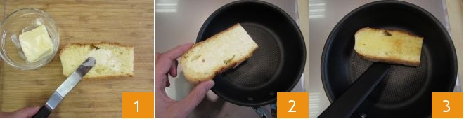 Para preparar el madame club sándwich empezad untando mantequilla en 6 rebanadas de pan de aproximadamente 1,5 cm de grosor 1. Colocadlas en una sartén antiadherente bien caliente y tostádlas un par de minutos 2, dándoles la vuelta a mitad de la cocción 3.<\/p>
