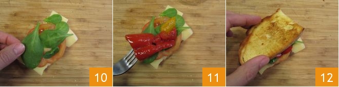 las hojas de espinacas baby 10 y los pimientos asados en conserva 11. Cerrad con la segunda rebanada de pan 12<\/span><\/p>