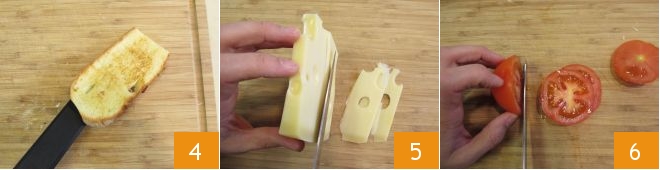 Apartadlas 4 y pasad al resto de las preparaciones. Cortad el queso en lonchas finas 5 y luego el tomate 6.<\/p>