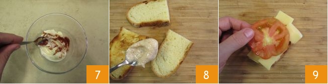 Verted la mayonesa en un bol y enriquecedla con pimentón ahumado 7; luego mezclad bien y untadla sobre las rebanadas de pan tostado 8. Montad la primera capa colocando unas lonchas de queso y de tomate 9,<\/p>