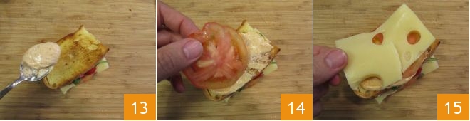 y montad la segunda capa con mayonesa 13, los tomates 14, el queso 15, <\/p>