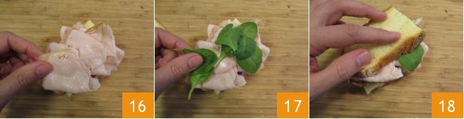 las lonchas de pavo 16 y completad con las hojas de espinacas baby 17. Cerrad finalmente con la última rebanada de pan 18.<\/p>