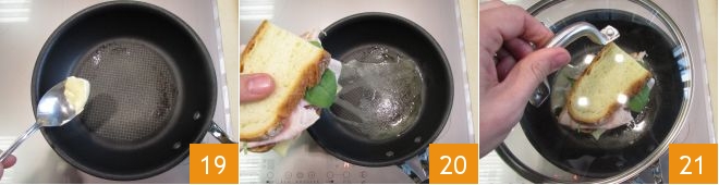 Derretid una nuez de mantequilla en una sartén antiadherente a fuego medio-bajo 19 y cuando la base esté lo bastante caliente añadid los sándwiches 20. Tostadlos unos 3 minutos por un lado manteniéndolos tapados con la tapa 21,<\/p>