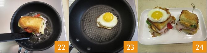 a mitad de la cocción dadles la vuelta y continuad otros 2 minutos siempre tapados 22. Cuando los sándwiches estén listos, apartadlos y, en la misma sartén aún engrasada, coced los huevos un par de minutos 23. Partid por la mitad los dos bocadillos y colocad vuestros huevos fritos sobre las dos mitades de vuestros madame club sándwich, y ya estarán listos para disfrutar: ¡buen provecho! 24<\/p>