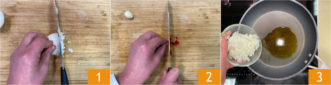 Para preparar la col rizada en sartén, primero limpia y pica la cebolla 1, luego también corta el chile 2. En una sartén vierte 20 g de aceite y añade la cebolla 3.