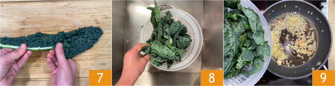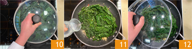 Mientras tanto, ocúpate de la col rizada: elimina el tallo central 7, lava bien las hojas bajo el agua escurriéndolas del exceso 8 y únelas en la sartén 9.