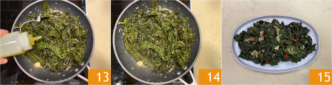 Pasados 20 minutos de cocción, elimina el ajo y añade el restante aceite, luego sube el fuego 13 y deja que tome sabor durante un minuto más 14. ¡Tu col rizada en sartén está lista para servirse 15!