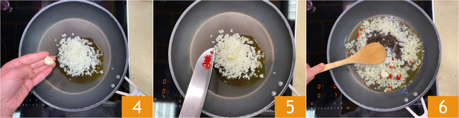 Añade el ajo 4 y el chile 5 y cocina a fuego lento durante unos 7-8 minutos, removiendo de vez en cuando 6.
