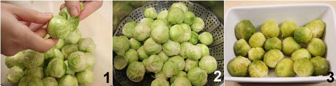 Limpiad las coles quitando las hojas dañadas más externas 1 y cocedlas al vapor durante 15 minutos 2. Cuando estén listas, colócalas en una fuente para horno 3,