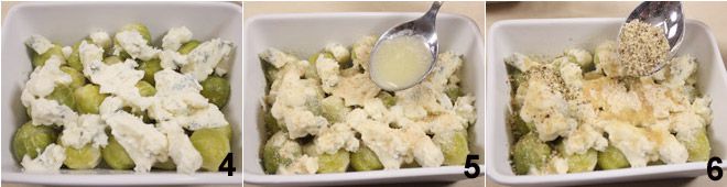 espolvoréalas con gorgonzola 4 y añade una cucharada de pan rallado. Clarifica la mantequilla calentándola en un cazo y espumándola hasta que adquiera la transparencia del aceite: humedece el pan rallado con una cucharada de mantequilla clarificada 5 y espolvorea todo con las nueces picadas 6. Coloca la fuente en el horno a 220 grados durante 10 minutos y luego enciende el grill unos minutos, hasta que en la superficie de las coles se forme una costra dorada. Saca las coles del horno con cuidado de no quemarte y sírvelas inmediatamente.
