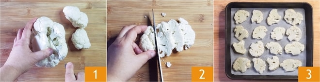 Para preparar la coliflor al horno, primero limpia la coliflor eliminando las hojas exteriores y el tallo, luego separa los floretes 1 y lávalos. Corta los floretes en rodajas de aproximadamente 1 cm de espesor 2 y colócalos en una bandeja forrada con papel de horno 3.