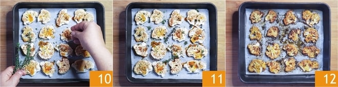 Aromatiza con las hojitas de tomillo 9 y procede con la cocción 10: hornea en horno estático precalentado a 190° durante 30 minutos, luego enciende el grill durante unos 5 minutos hasta dorar. ¡Tu coliflor al horno está lista para disfrutarse 12!