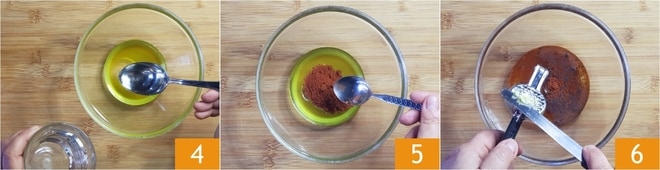 Vierte el aceite y el agua en un tazón pequeño 4, luego añade el pimentón 5 y el ajo picado o triturado finamente 6.