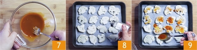 Emulsiona bien con un tenedor 7. Salpica ligeramente las rodajas de coliflor 8 y condiméntalas con la emulsión 9.